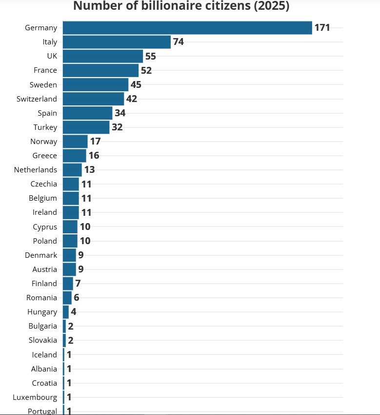 Në Evropë, shumë vende kanë numër të konsiderueshëm miliarderësh, dhe kjo tregon përqendrimin e jashtëzakonshëm të pasurisë tek individë të caktuar.