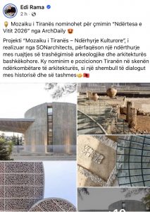 Mozaiku i Tiranës është nominuar për çmimin “Ndërtesa e Vitit 2026” nga ArchDaily. Lajmin e jep kryeministri Edi Rama.