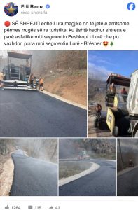 “Së shpejti edhe Lura magjike do të jetë e arritshme përmes rrugës së re turistike, ku është hedhur shtresa e parë e asfaltit mbi segmentin Peshkopi – Lurë dhe po vazhdon puna mbi segmentin Lurë- Rrëshen”, shkruan Rama.