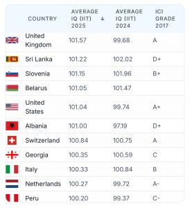 Shqiptarët janë populli më inteligjent në Ballkan dhe jo vetëm. Të dhënat e mesatares së IQ-së për vitin 2025, të publikuara nga faqja International IQ Test, e rendisin Shqipërinë të 22-tën globalisht, mes 137 shteteve, duke lënë pas edhe Zvicrën, Italinë, Francën dhe Greqinë.